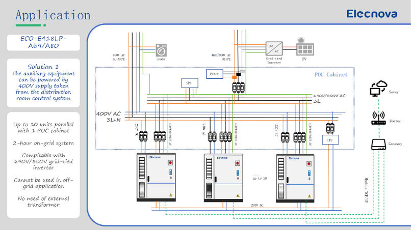 For 690V or 800V PV fields,the energy storage system need additional 400V auxiliary power supply,the storage system can be integrated through a centralized point-of-connection(POC) cabinet with transformer integration. This approach provides: